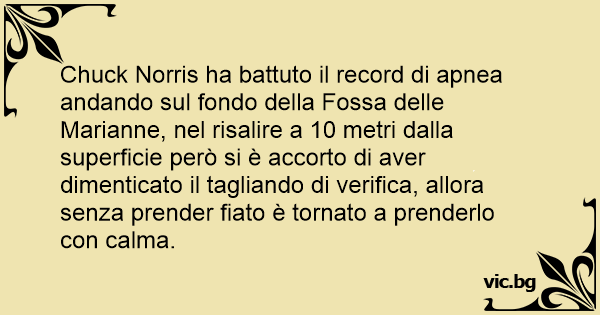 Chuck Norris ha battuto il record di apnea andando sul fondo della Fossa delle Marianne, nel risalire a 10 metri dalla superficie però si è accorto di aver dimenticato il tagliando di verifica, allora senza prender fiato è tornato a prenderlo соn calma.