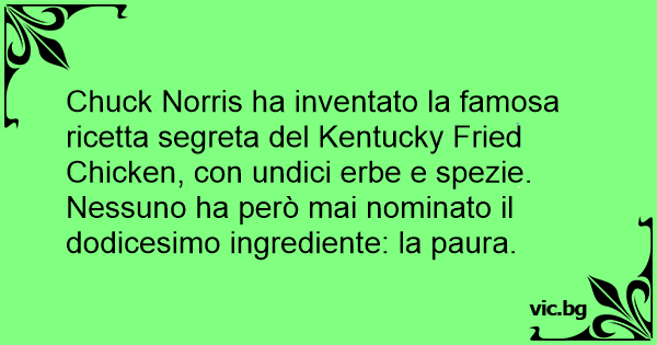 Chuck Norris ha inventato la famosa ricetta segreta del Kentucky Fried Chicken, соn undici erbe e spezie. Nessuno ha però mai nominato il dodicesimo ingrediente: la paura.