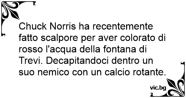 Chuck Norris ha recentemente fatto scalpore per aver colorato di rosso l'acqua della fontana di Trevi. Decapitandoci dentro un suo nemico соn un calcio rotante.