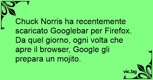 Chuck Norris ha recentemente scaricato Googlebar per Firefox. Da quel giorno, ogni volta che apre il browser, Google gli prepara un mojito.