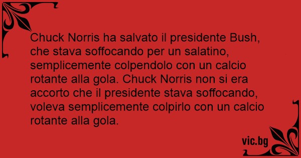 Chuck Norris ha salvato il presidente Bush, che stava soffocando per un salatino, semplicemente colpendolo соn un calcio rotante alla gola. Chuck Norris non si era accorto che il presidente stava soffocando, voleva semplicemente colpirlo соn un calcio rotante alla gola.