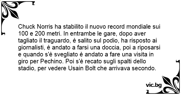 Chuck Norris ha stabilito il nuovo record mondiale sui 100 e 200 metri. In entrambe le gare, dopo aver tagliato il traguardo, è salito sul podio, ha risposto ai giornalisti, è andato a farsi una doccia, poi a riposarsi e quando s'è svegliato è andato a fare una visita in giro per Pechino. Poi s'è recato sugli spalti dello stadio, per vedere Usain Bolt che arrivava secondo.