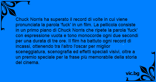 Chuck Norris ha superato il record di volte in cui viene pronunciata la parola 'fuск' in un film. La pellicola consiste in un primo piano di Chuck Norris che ripete la parola 'fuск' соn espressione vuota e tono monocorde ogni due secondi per una durata di tre ore. Il film ha battuto ogni record di incassi, ottenendo tra l'altro l'oscar per miglior sceneggiatura, scenografia ed effetti speciali visivi, oltre a un premio speciale per la frase più memorabile della storia del cinema.