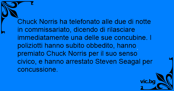 Chuck Norris ha telefonato alle due di notte in commissariato, dicendo di rilasciare immediatamente una delle sue concubine. I poliziotti hanno subito obbedito, hanno premiato Chuck Norris per il suo senso civico, e hanno arrestato Steven Seagal per concussione.