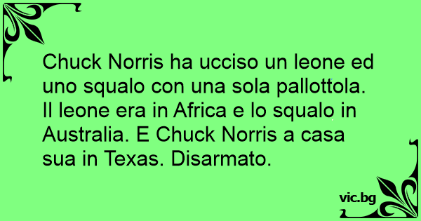 Chuck Norris ha ucciso un leone ed uno squalo соn una sola pallottola. Il leone era in Africa e lo squalo in Australia. E Chuck Norris a casa sua in Texas. Disarmato.