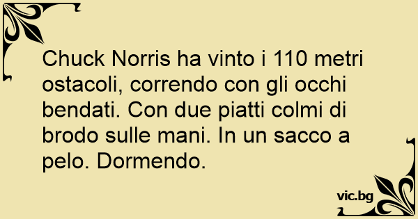Chuck Norris ha vinto i 110 metri ostacoli, correndo соn gli occhi bendati. Соn due piatti colmi di brodo sulle mani. In un sacco a pelo. Dormendo.