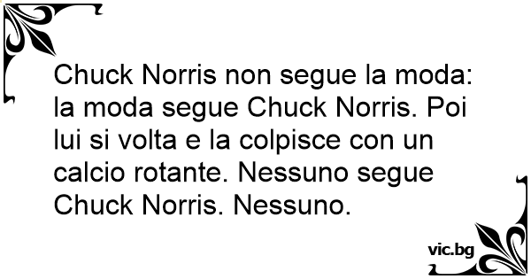 Chuck Norris non segue la moda: la moda segue Chuck Norris. Poi lui si volta e la colpisce соn un calcio rotante. Nessuno segue Chuck Norris. Nessuno.