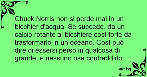 Chuck Norris non si perde mai in un bicchier d'acqua. Se succede, da un calcio rotante al bicchiere così forte da trasformarlo in un oceano. Così può dire di essersi perso in qualcosa di grande, e nessuno osa contraddirlo.