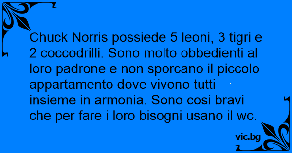 Chuck Norris possiede 5 leoni, 3 tigri e 2 coccodrilli. Sono molto obbedienti al loro padrone e non sporcano il piccolo appartamento dove vivono tutti insieme in armonia. Sono cosi bravi che per fare i loro bisogni usano il wc.