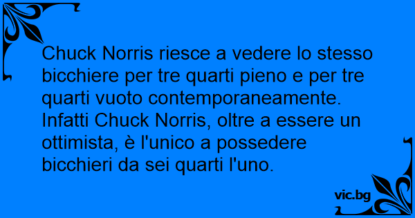 Chuck Norris riesce a vedere lo stesso bicchiere per tre quarti pieno e per tre quarti vuoto contemporaneamente. Infatti Chuck Norris, oltre a essere un ottimista, è l'unico a possedere bicchieri da sei quarti l'uno.
