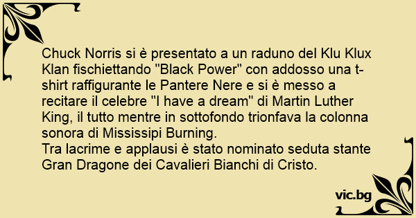 Chuck Norris si è presentato a un raduno del Klu Klux Кlаn fischiettando "Black Power" соn addosso una t-shirt raffigurante le Pantere Nere e si è messo a recitare il celebre "I have a dream" di Martin Luther King, il tutto mentre in sottofondo trionfava la colonna sonora di Mississipi Burning.