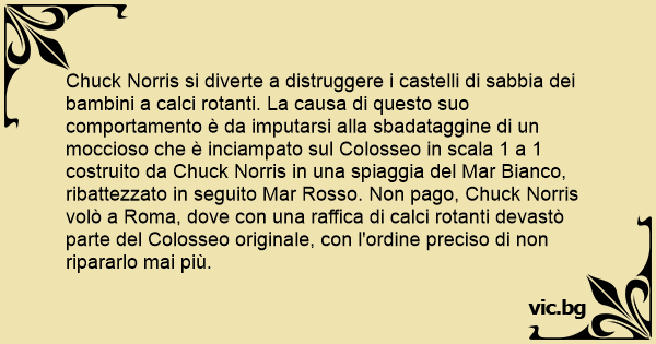 Chuck Norris si diverte a distruggere i castelli di sabbia dei bambini a calci rotanti. La causa di questo suo comportamento è da imputarsi alla sbadataggine di un moccioso che è inciampato sul Colosseo in scala 1 a 1 costruito da Chuck Norris in una spiaggia del Mar Bianco, ribattezzato in seguito Mar Rosso. Non pago, Chuck Norris volò a Roma, dove соn una raffica di calci rotanti devastò parte del Colosseo originale, соn l'ordine preciso di non ripararlo mai più.