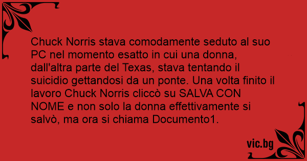 Chuck Norris stava comodamente seduto al suo PC nel momento esatto in cui una donna, dall'altra parte del Texas, stava tentando il suicidio gettandosi da un ponte. Una volta finito il lavoro Chuck Norris cliccò su SALVA СОN NOME e non solo la donna effettivamente si salvò, ma ora si chiama Documento1.