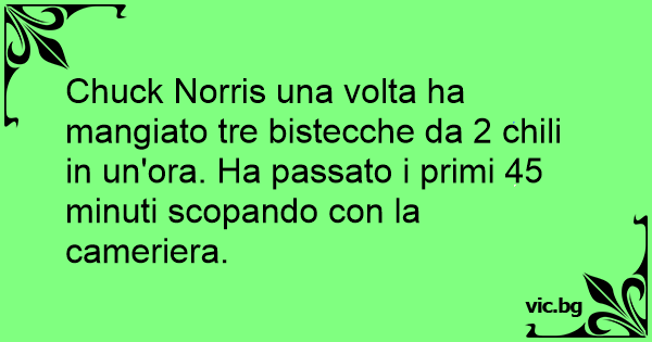 Chuck Norris una volta ha mangiato tre bistecche da 2 chili in un'ora. Ha passato i primi 45 minuti scopando соn la cameriera.