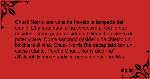 Chuck Norris una volta ha trovato la lampada del Genio. L'ha strofinata, e ha concesso al Genio due desideri. Come primo desiderio il Genio ha chiesto di poter vivere. Come secondo desiderio ha chiesto un bicchiere di vino. Chuck Norris l'ha decapitato соn un calcio rotante. Perchè Chuck Norris dice "no" all'alcool. E non esaudisce nessun desiderio. Mai.