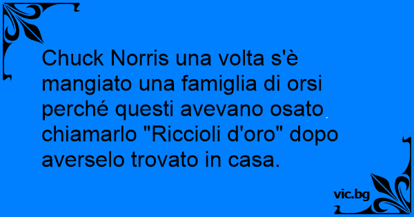 Chuck Norris una volta s'è mangiato una famiglia di orsi perché questi avevano osato chiamarlo "Riccioli d'oro" dopo averselo trovato in casa.
