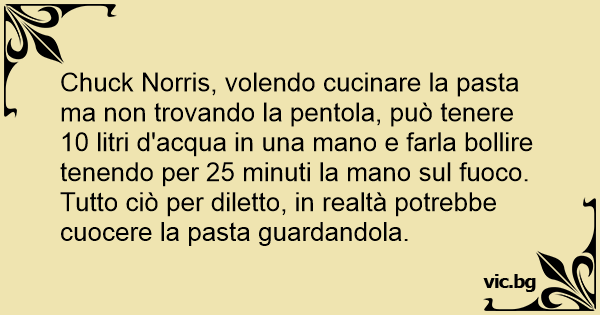 Chuck Norris, volendo cucinare la pasta ma non trovando la pentola, può tenere 10 litri d'acqua in una mano e farla bollire tenendo per 25 minuti la mano sul fuoco. Tutto ciò per diletto, in realtà potrebbe cuocere la pasta guardandola.