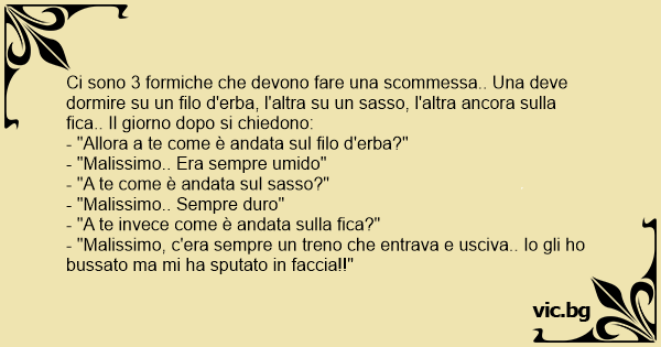 Ci sono 3 formiche che devono fare una scommessa.. Una deve dormire su un filo d'erba, l'altra su un sasso, l'altra ancora sulla fiса.. Il giorno dopo si chiedono: