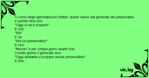 Ci sono degli spermatozooi militari: questi vanno dal generale dei preservativi e questo dice loro: