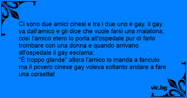 Ci sono due amici cinesi e tra i due uno è gаy. Il gаy va dall'amico e gli dice che vuole farsi una malatona, così l'amico etero lo porta all'ospedale pur di farlo тrомваrе соn una donna e quando arrivano all'ospedale il gаy esclama: