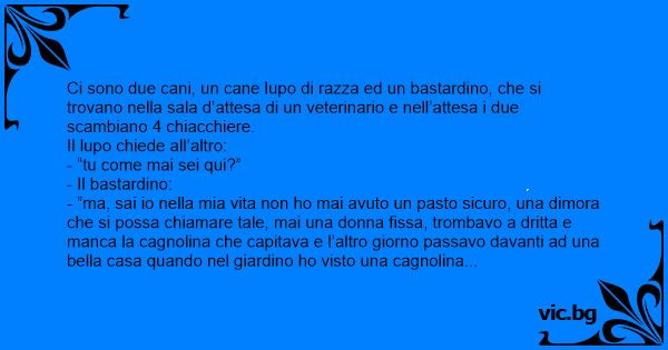 Ci sono due cani, un cane lupo di razza ed un bastardino, che si trovano nella sala d’attesa di un veterinario e nell’attesa i due scambiano 4 chiacchiere.