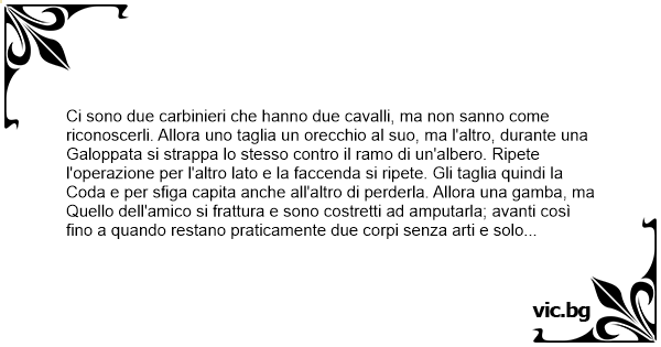 Ci sono due carbinieri che hanno due cavalli, ma non sanno come riconoscerli. Allora uno taglia un orecchio al suo, ma l'altro, durante una