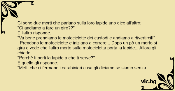 . Prendono le motociclette e iniziano a correre... Dopo un pò un morto si gira e vede che l'altro morto sulla motocicletta porta la lapide... Allora gli chiede: