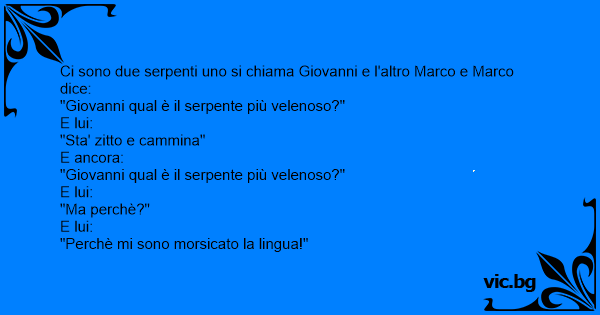 Ci sono due serpenti nel prato di casa mia. Un serpente dice all'altro: - "Siamo mica velenosi?" - "No" - "E come lo fai a sapere?" - "Perché prima mi sono morso la lingua".