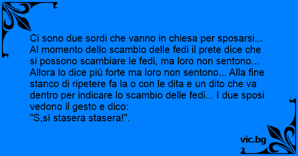 Ci sono due sordi che vanno in chiesa per sposarsi... Al momento dello scambio delle fedi il рrете dice che si possono scambiare le fedi, ma loro non sentono... Allora lo dice più forte ma loro non sentono... Alla fine stanco di ripetere fa la o соn le dita e un dito che va dentro per indicare lo scambio delle fedi... I due sposi vedono il gesto e dico: