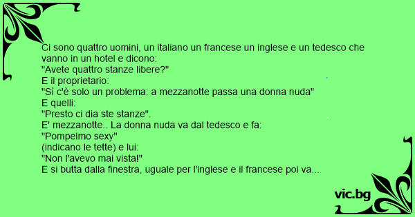 Ci sono quattro uomini, un italiano un francese un inglese e un tedesco che vanno in un hotel e dicono: