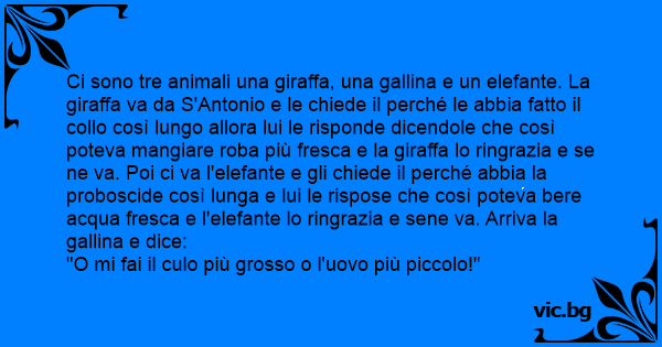 Ci sono tre animali una giraffa, una gallina e un elefante. La giraffa va da S'Antonio e le chiede il perché le abbia fatto il collo così lungo allora lui le risponde dicendole che così poteva mangiare roba più fresca e la giraffa lo ringrazia e se ne va. Poi ci va l'elefante e gli chiede il perché abbia la proboscide così lunga e lui le rispose che così poteva bere acqua fresca e l'elefante lo ringrazia e sene va. Arriva la gallina e dice: