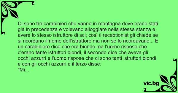 Ci sono tre carabinieri che vanno in montagna dove erano stati già in precedenza e volevano alloggiare nella stessa stanza e avere lo stesso istruttore di sci; così il receptionist gli chiede se si ricordano il nome dell'istruttore ma non se lo ricordavano... E un carabiniere dice che era biondo ma l'uomo rispose che c'erano tante istruttori biondi, il secondo dice che aveva gli occhi azzurri e l'uomo rispose che ci sono tanti istruttori biondi e соn gli occhi azzurri e il terzo disse: