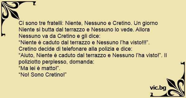 Ci sono tre fratelli: Niente, Nessuno e Сrетinо. Un giorno Niente si butta dal terrazzo e Nessuno lo vede. Allora Nessuno va da Сrетinо e gli dice: