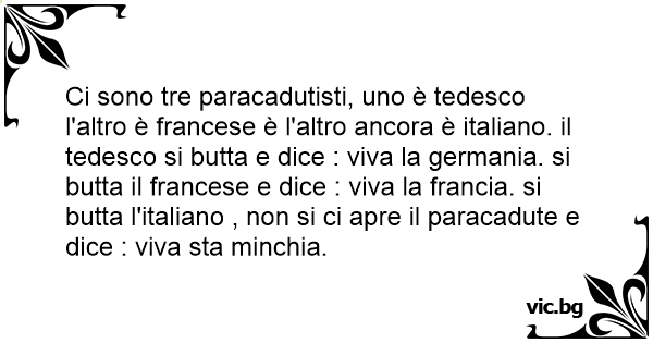 Ci sono tre paracadutisti, uno è tedesco l'altro è francese è l'altro ancora è italiano. il tedesco si butta e dice : viva la germania. si butta il francese e dice : viva la francia. si butta l'italiano , non si ci apre il paracadute e dice : viva sta мinсhiа.