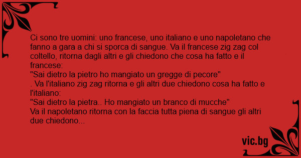 Ci sono tre uomini: uno francese, uno italiano e uno napoletano che fanno a gara a chi si sporca di sangue. Va il francese zig zag col coltello, ritorna dagli altri e gli chiedono che cosa ha fatto e il francese:
