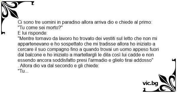 Ci sono tre uomini in paradiso allora arriva dio e chiede al primo:
