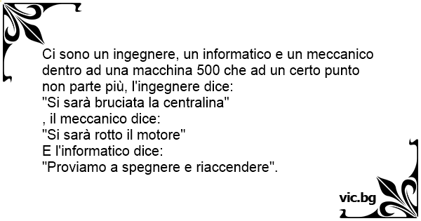 Ci sono un ingegnere, un informatico e un meccanico dentro ad una macchina 500 che ad un certo punto non parte più, l'ingegnere dice: