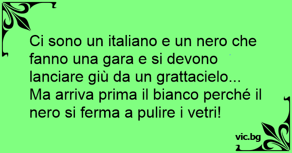 Ci sono un italiano e un nero che fanno una gara e si devono lanciare giù da un grattacielo... Ma arriva prima il bianco perché il nero si ferma a pulire i vetri!