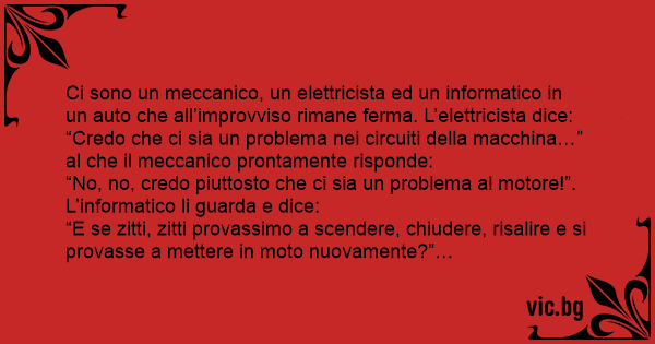 Ci sono un meccanico, un elettricista ed un informatico in un auto che all’improvviso rimane ferma. L’elettricista dice: “Credo che ci sia un problema nei circuiti della macchina…” al che il meccanico prontamente risponde: “No, no, credo piuttosto che ci sia un problema al motore!”. L’informatico li guarda e dice: “E se zitti, zitti provassimo a scendere, chiudere, risalire e si provasse a mettere in moto nuovamente?”…