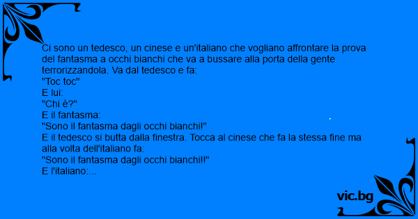 Ci sono un tedesco, un cinese e un'italiano che vogliano affrontare la prova del fantasma a occhi bianchi che va a bussare alla porta della gente terrorizzandola. Va dal tedesco e fa: