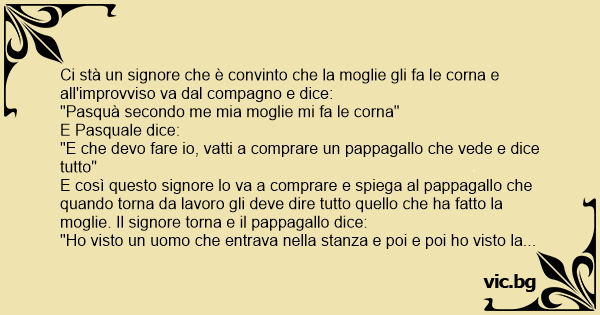 E così questo signore lo va a comprare e spiega al pappagallo che quando torna da lavoro gli deve dire tutto quello che ha fatto la moglie. Il signore torna e il pappagallo dice: