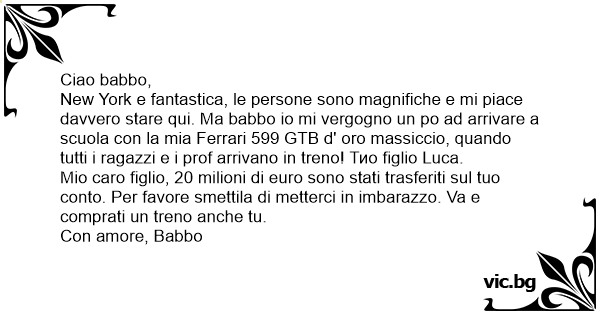 New York e fantastica, le persone sono magnifiche е mi piace davvero stare qui. Ма babbo io mi vergogno un рo ad arrivare а scuola соn la mia Ferrari 599 GTB d' oro massiccio, quando tutti i ragazzi е i prof arrivano in treno! Тио figlio Luca.