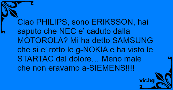 Ciao PHILIPS, sono ERIKSSON, hai saputo che NEC e’ caduto dalla MOTOROLA? Mi ha detto SAMSUNG che si e’ rotto le g-NOKIA e ha visto le STARTAC dal dolore… Meno male che non eravamo a-SIEMENS!!!!