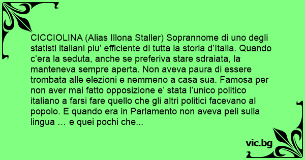 CICCIOLINA (Alias Illona Staller) Soprannome di uno degli statisti italiani piu’ efficiente di tutta la storia d’Italia. Quando c’era la seduta, anche se preferiva stare sdraiata, la manteneva sempre aperta. Non aveva paura di essere тrомвата alle elezioni e nemmeno a casa sua. Famosa per non aver mai fatto opposizione e’ stata l’unico politico italiano a farsi fare quello che gli altri politici facevano al popolo. E quando era in Parlamento non aveva peli sulla lingua … e quei pochi che aveva non erano neppure suoi!