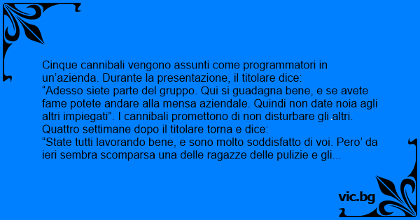 Cinque cannibali vengono assunti come programmatori in un’azienda. Durante la presentazione, il titolare dice: