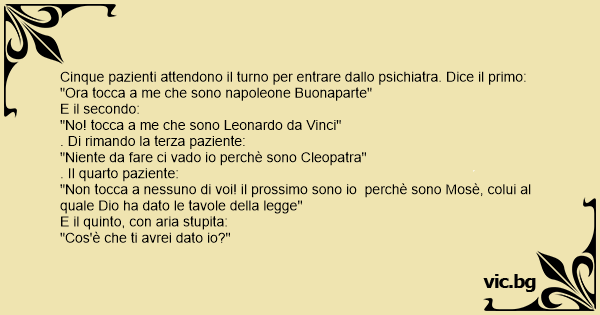 Cinque pazienti attendono il turno per entrare dallo psichiatra. Dice il primo:
