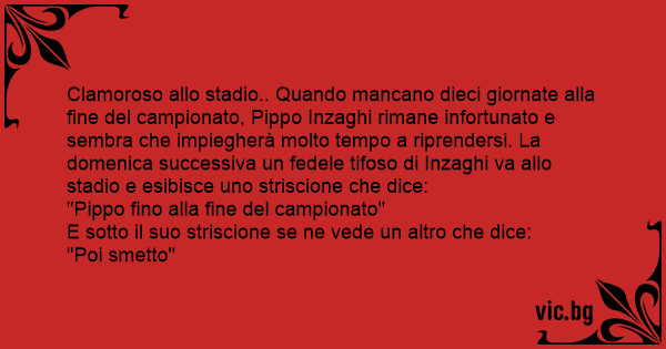Clamoroso allo stadio.. Quando mancano dieci giornate alla fine del campionato, Pippo Inzaghi rimane infortunato e sembra che impiegherà molto tempo a riprendersi. La domenica successiva un fedele tifoso di Inzaghi va allo stadio e esibisce uno striscione che dice:
