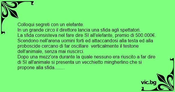 Davanti a tutti sussurra qualcosa nell'orecchio dell'elefante ed immediatamente fa cenno di SI risolutamente ed a lungo соn la testa. Incassa il premio e se ne va felice.