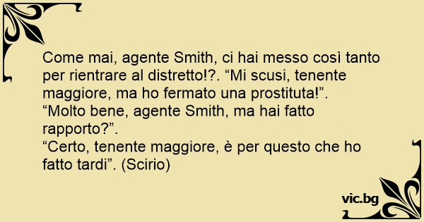 Come mai, agente Smith, ci hai messo così tanto per rientrare al distretto!?. “Mi scusi, tenente maggiore, ma hо fermato una prostituta!”.