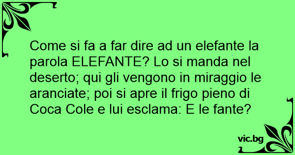 Come si fa a far dire ad un elefante la parola ELEFANTE? Lo si manda nel deserto; qui gli vengono in miraggio le aranciate; poi si apre il frigo pieno di Coca Cole e lui esclama: E le fante?